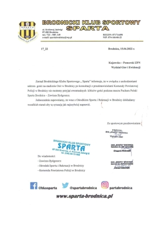 Z uwagi na wszelkie zarzucania kibicom Zawiszy Bydgoszcz i wmawianiu na różnych portalch kibicowskich o tym, że klub Sparta Brodnica nie wysłał do naszego klubu żadnego pisma odnośnie nie wpuszczenia nas na mecz Pucharu Polski udostępniamy kopię pisma, które zostało wysłane z Brodnicy.