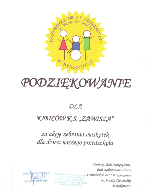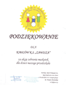 Dziś otrzymaliśmy dyplom z podziękowaniem za listopadową zbiórkę zabawek dla przedszkola nr 61 im. Wandy Chotomskiej na Wyżynach, które ucierpiało wskutek wybuchu gazu.