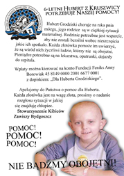 Apelujemy do wszystkich kibiców, sympatyków Zawiszy oraz ludzi dobrej woli o wsparcie dla sześcioletniego Huberta z Kruszwicy, który choruje na raka pnia mózgu, a jego rodzice są w ciężkiej sytuacji materialnej. Rodzinie potrzebne jest wsparcie, aby nie zostali bezsilni wobec nieszczęścia jakie ich spotkało. Każda złotówka pomoże im uwierzyć, że są wśród nich życzliwi ludzie, którzy nie są obojętni...