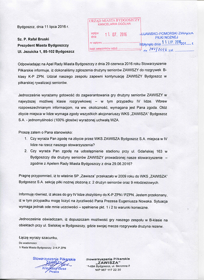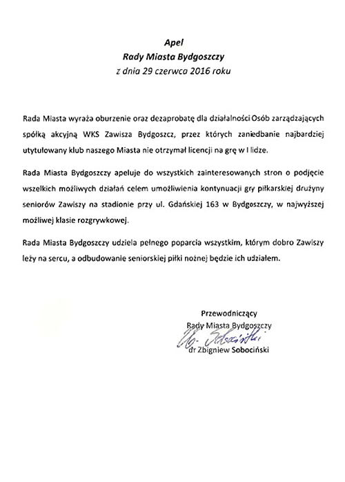 Stowarzyszenie Piłkarskie Zawisza odpowiedziało na apel Rady Miasta Bydgoszczy z dnia 29.06.2016r